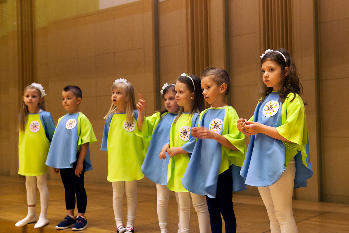 Chór Małe Nutki pod dyrygenturą pani Magdaleny Sitkowskiej podczas koncertu familijnego w Filharmonii Świętokrzyskiej.